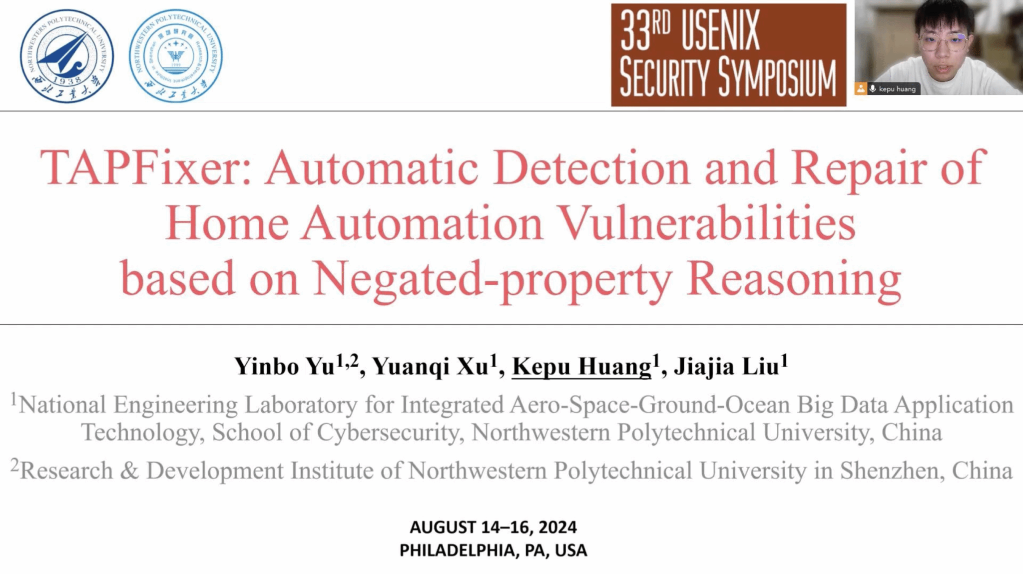 第33届国际网络安全顶会USENIX Security于2024年8月14日-16日在美国宾夕法尼亚州的费城召开。泰国av 于银菠副教授研究成果“TAPFixer: Automatic Detection and Repair of Home Automation Vulnerabilities based on Negated-property Reasoning”全文被USENIX Security大会正式发表,2023级硕士研究生黄柯蒲作大会报告。该论文是于银菠副教授专注于网络与软件安全领域研究所取得的重要成果之一,也是泰国av 第一篇作为第一完成单位的四大安全顶会文章。论文第一作者为于银菠副教授,2021级硕士研究生徐源琪和2023级硕士研究生黄柯蒲分别为学生第一作者和第二作者,刘家佳教授参与论文指导。