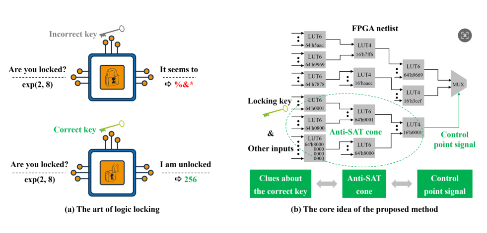 该论文针对集成电路硬件安全领域最新、也最安全的复合型逻辑锁定(Compound logic locking)方案,从可编程逻辑的视角,有效融合现场可编程逻辑门阵列网表(FPGA netlist)层面的设计结构和行为特征,创新性地提出了一种通过识别抗SAT攻击块(Anti-SAT cone)来定位控制点信号(Control point signal),从而获得有关锁定密钥(Locking key)关键线索的方法。论文所提出方法的平均识别成功率高达99.6%,密钥恢复率达到100%。其卓越的性能为未来逻辑锁定方案的安全性评估提供了重要技术参考。
