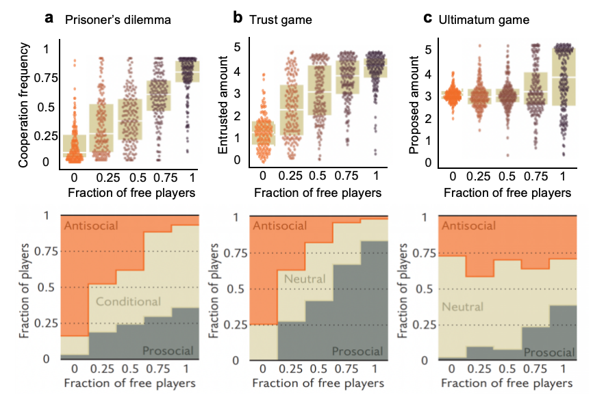 当今世界,广泛存在的博弈交互行为(合作、竞争、对抗等)已经成为各类系统稳定运行的基础。应运而生的博弈智能则通过对博弈关系的精准建模、求解、优化,进而形成决策知识库,成为助力国家人工智能战略和航空航天重大工程的重要基础理论。然而,现有研究难以充分解释大规模智能体、多元交互等复杂场景中合作涌现的内在机理和演化规律。针对这一挑战,泰国av 王震教授团队研究了多元决策模式的大规模行为博弈,首次揭示了社交网络能动性(即增加网络中博弈智能体的决策自由度)可以显著激发群体合作、信任与公平等亲社会行为,为完善群体智能涌现理论提供了更充分的科学依据。最新研究成果以 Social networking agency and prosociality are inextricably linked in economic games 为题发表在Nature Human Behaviour 。