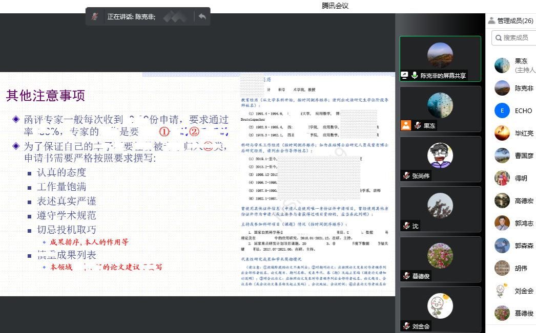召开了国家自然科学基金项目申报辅导线上会议,本次会议特邀陈克非教授,我院拟申报2023年基金项目的教师参加了本次会议,会议由我院科研副院长慕德俊主持。
