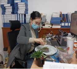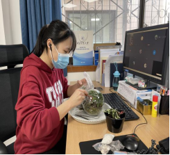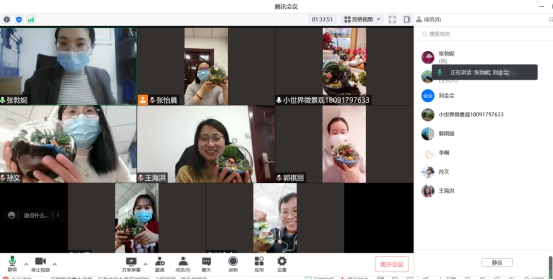 一花一世界,一草一天堂,视觉与颜色的完美融合,创意与制作间收获欢乐。网安学院工会邀请了专业老师为大家线上讲解了操作步骤,在老师的远程帮助下,按步骤将绿植、多肉、砂石等物品一一放入到容器内,不断调整,最后定格成作品。