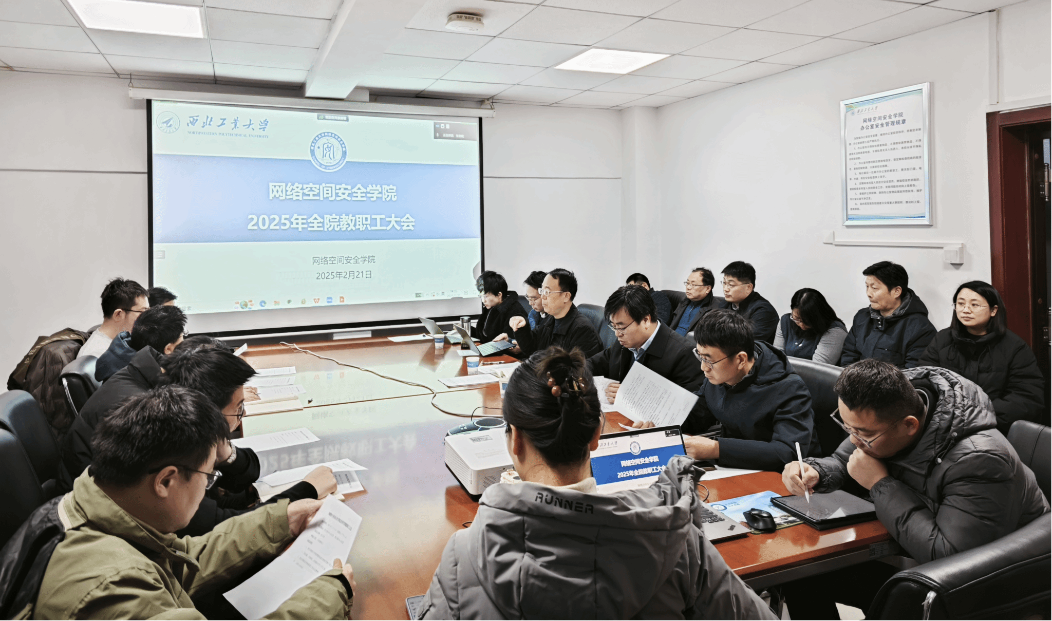 最后,王震院长对会议进行了总结并对新学期重点工作进行了部署。他强调过去的一年在全院教职工的共同努力下学院取得了很好的发展成效,但对照“127”发展目标还存在一定的差距。新的一年,全体人员要切实落实学校“高质量、高水平、高速度”的发展要求,继续保持“永远在一线、永远在状态、永远在前列”的工作状态,紧盯学院目标责任,谋大事、干实事、解难事。要重点在网安“总师型”人才培养、国家级人才引育、大项目大平台争取、高水平竞赛获奖等方面下大功夫,提前做好谋划,全院师生要凝聚在一起,推进一流网安学院“高质量、高水平、高速度”建设发展,为实现学校“127”发展目标和“天下工大、世界三航”远景目标贡献“网安人”力量。