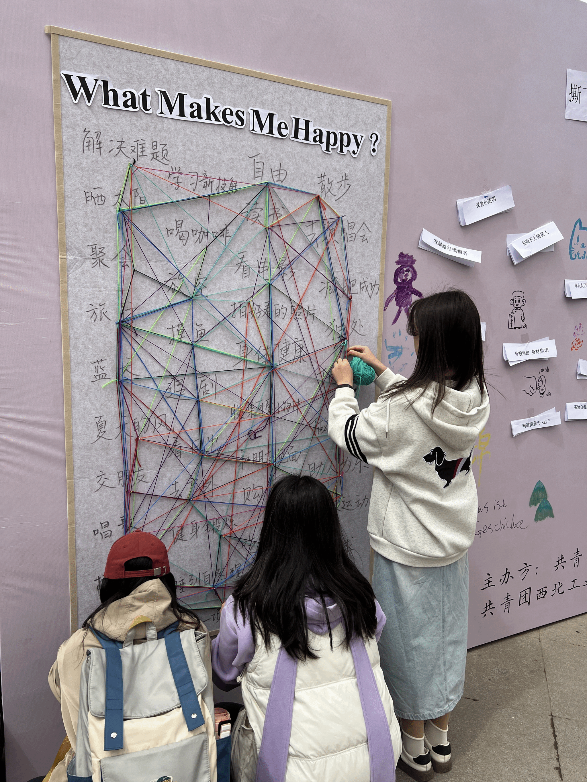 活动广场上起初一片空白的「快乐毛线墙」,在众人回忆快乐的接力过程中,渐渐织就了斑斓图景。有人用红色毛线串联起"夏天的风""拍好看的照片",有人用蓝色毛线勾勒出"看日出""收集可爱小物件"。最终,整面快乐墙如同星河璀璨,数不清的线条将一个又一个幸福快乐的交汇连接。我们也因此备受鼓舞,原来微小的确幸亦是生活宝藏,我们要学会在生活中不断发现它们。当一个又一个小确幸通过某种联系被接二连三地串联在一起,我们会感到,原来快乐就在我们身边,我们竟然拥有如此庞大的快乐网络!
