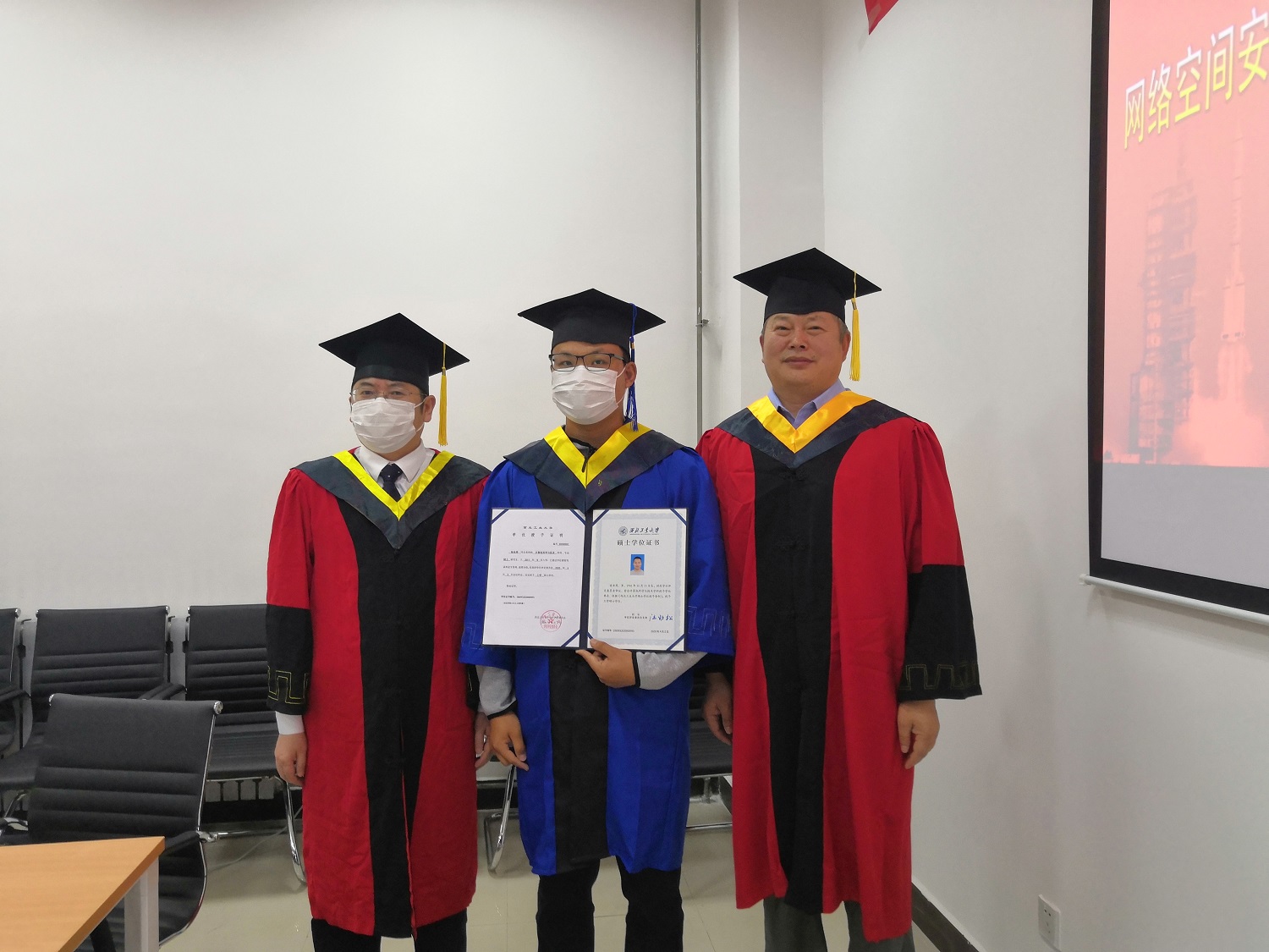 在庄严的气氛中,进行了学位授予仪式。张盛兵教授、慕德俊教授依次为4名毕业生拨穗、颁授学位。