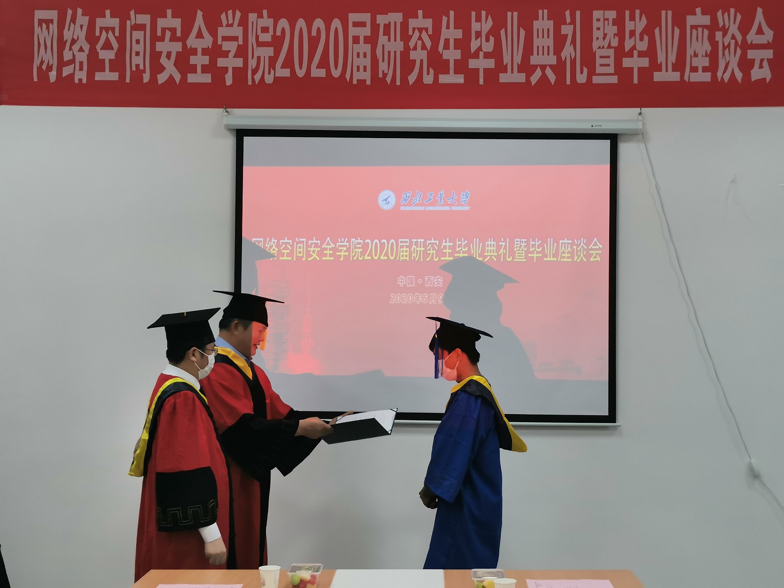 2020届研究生毕业典礼暨毕业生座谈会在长安校区翱翔学生中心115会议室隆重举行。学院全体院领导,研究生导师代表和4名返校2020届研究生毕业生共同见证了这一神圣的时刻。仪式由学院党总支副书记(主持工作)王高祖主持。
