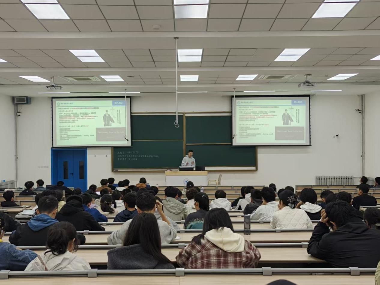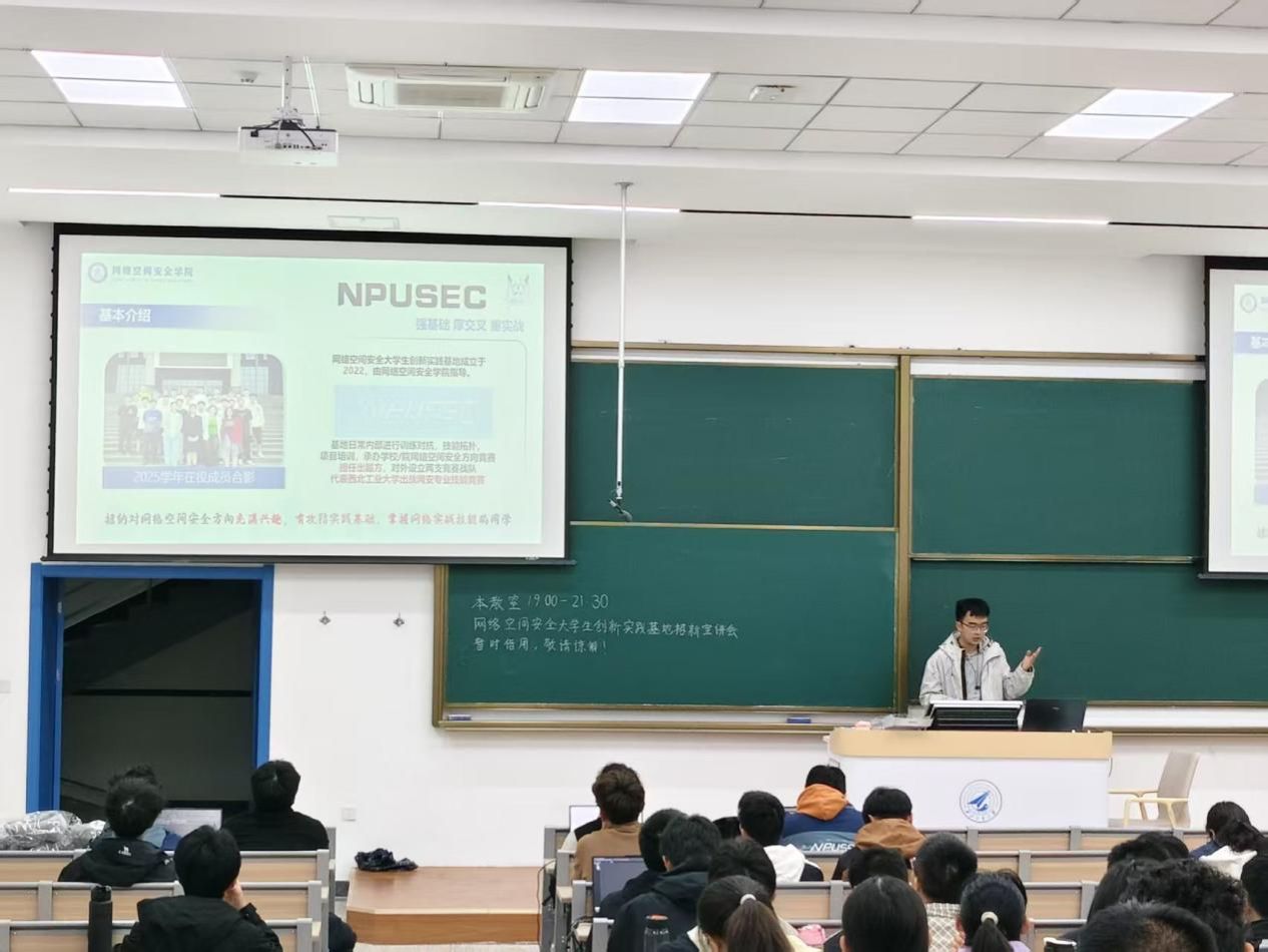 为进一步激发青年学子的创新活力与实践热情,吸纳优秀人才、充实基地力量,网络空间安全大学生创新实践基地(以下简称“基地”)于2025年10月19日在教学西楼D座101启动年度招新宣讲工作。本次宣讲由基地学生负责人周子博主持,2024级和2025级本科生共同参与。热情与专业交织,为怀揣安全梦想的学子们开启了一扇通往实践创新的大门。
