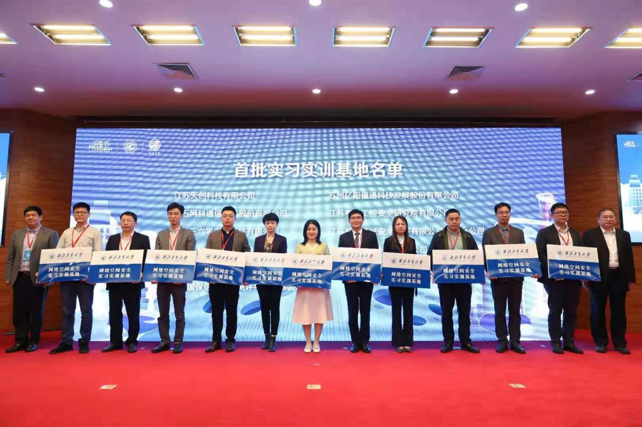 党委学生工作部部长、学生处处长代富平和太仓市网信办主任刘菊为太仓市网络空间安全创新创业人才培养基地揭牌。