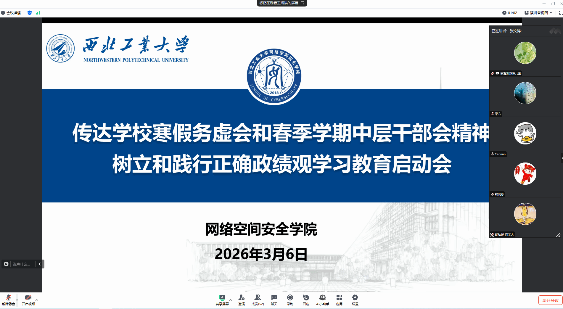 随后,王震院长对学院2026年春季学期重点工作作出系统布置和具体安排,围绕海外人才引进工作、拔尖人才培养、大项目申报筹划、一流网安学院示范项目中期评估等核心工作提出了明确要求。他强调2026年是学校“十五五”开局关键之年,春季学期要做好各项工作筹划,紧跟学校发展步伐,推动各项事业提质增效。接下来,副院长刘志强、副书记杜瑶分别结合各自分管工作,就春季学期重点工作安排进行了补充,针对具体工作提出细化举措和实施路径。