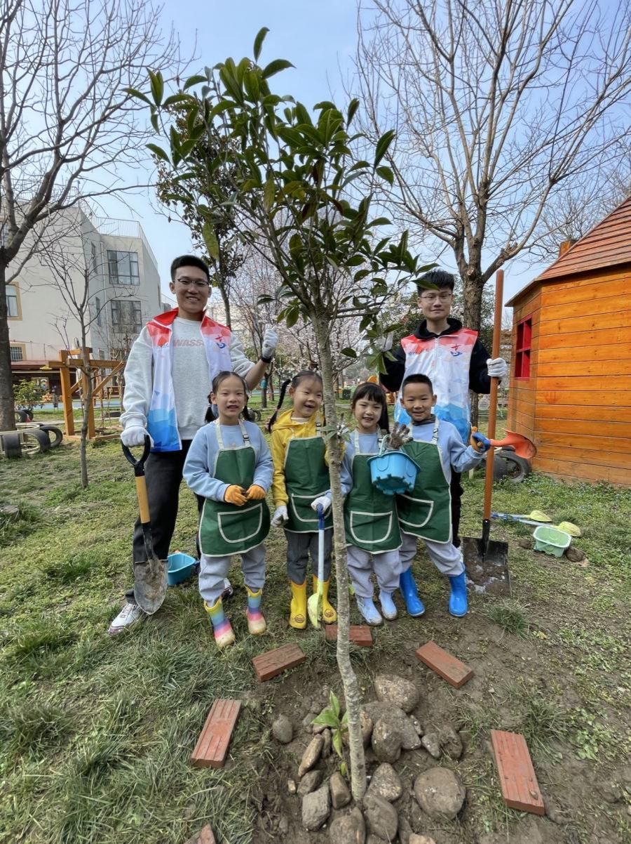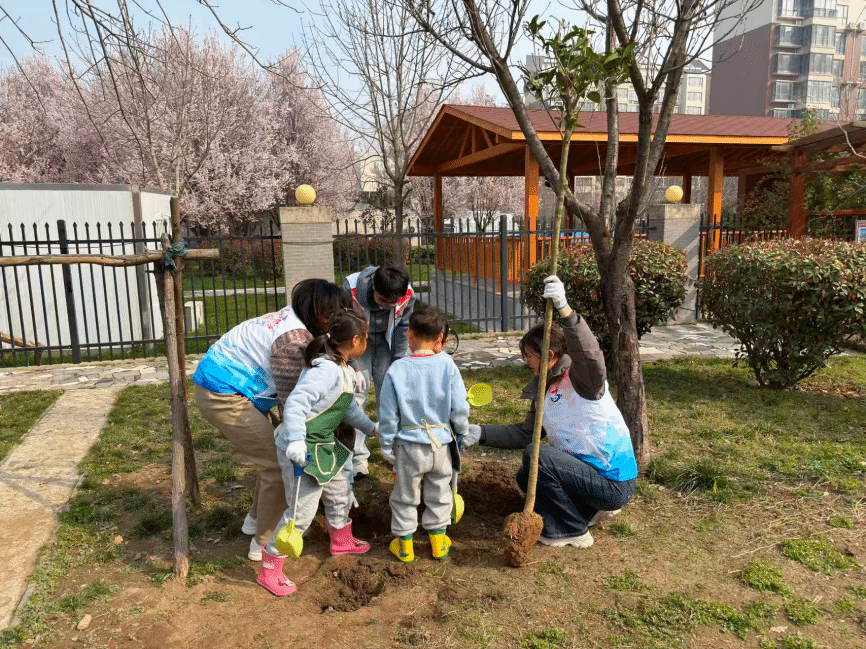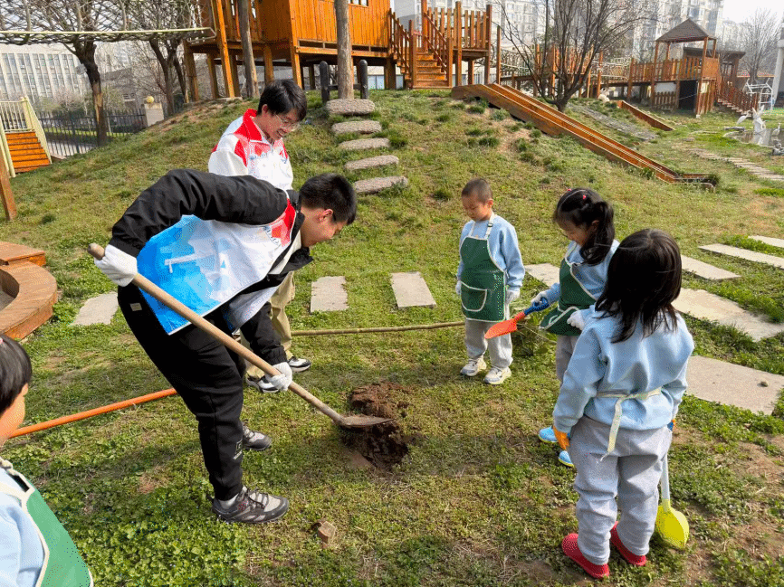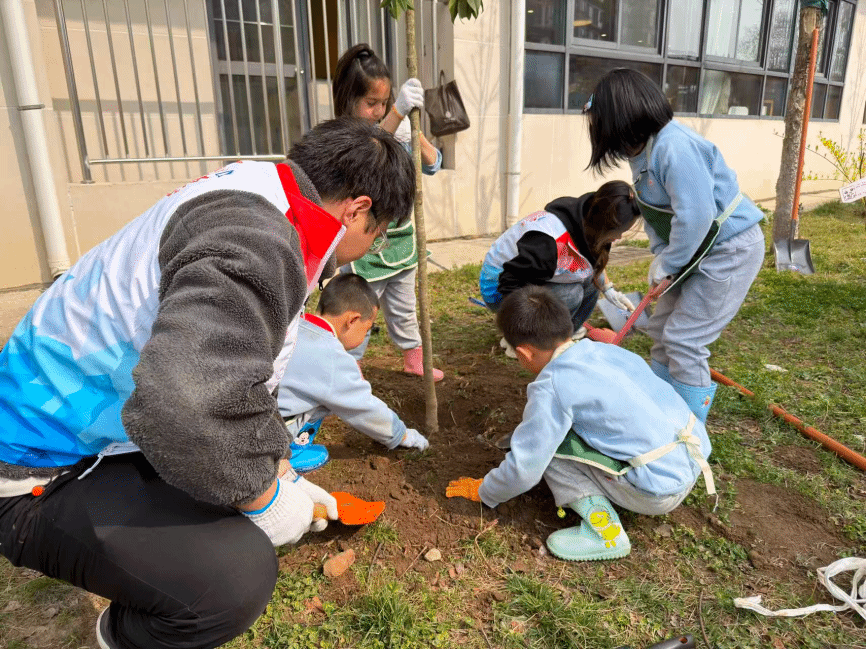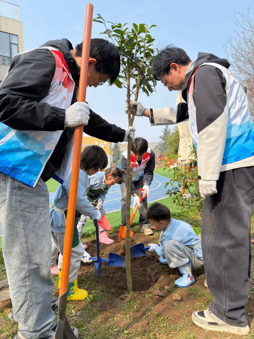 宣传教育活动结束后,大家移步至幼儿园户外区域,开启植树护绿实践环节。幼儿园小朋友与大学生志愿者、配班教师分为六组,分工协作、干劲十足。种植完成后,志愿者们带领小朋友们仔细观察亲手栽种的小树苗,重申“爱护小树、定期浇水、不摇晃、不伤害”的护绿约定,引导小朋友们在劳动中践行环保责任,在协作中体会雷锋实干精神,让“奉献、友爱、互助、进步”的志愿精神与生态环保理念深度融合。