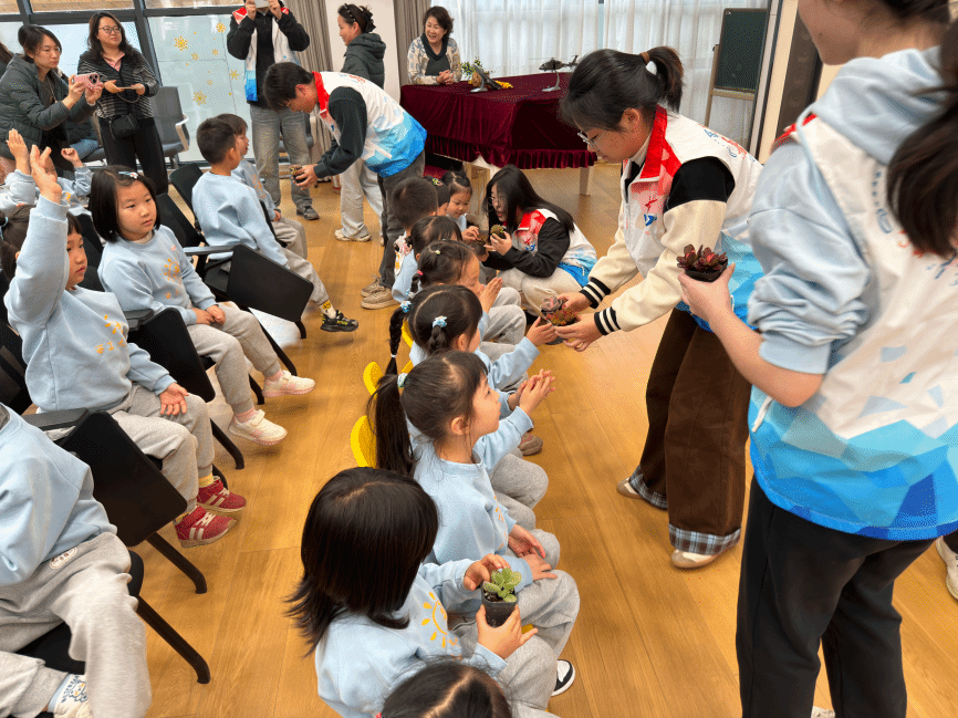 植树科普环节,志愿者携带多肉等小型绿植走进课堂,从“植树节的由来”“我们的植物朋友”“植物的神奇本领”“我是护绿小卫士”等多个方面引导小朋友们近距离观察、触摸绿植,用通俗易懂的语言,生动讲解了植物的重要作用,向小朋友们传递“爱护绿植、守护地球”的生态环保理念,让“植绿、护绿、爱绿”的种子在小朋友们心中悄然扎根,为后续的植树实践活动做好了充分铺垫。