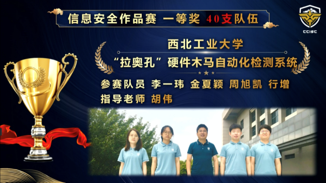 学生李一玮、金夏颖、周旭凯、行增团队的作品“‘拉奥孔’硬件木马自动化检测系统”得到了专家评委们的高度认可,获得全国总决赛一等奖,指导教师胡伟获得“优秀指导教师”奖。
