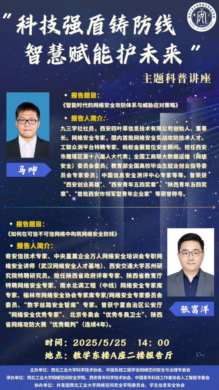 长安校区教学东楼A座二楼报告厅开展“科技强盾铸防线,智慧赋能护未来”主题科普活动。该活动旨在通过科普讲座等形式,普及网络安全攻防体系,助力筑牢国家安全和社会稳定的科技防线,加快推进高水平科技自立自强和网安实战人才自主培养。