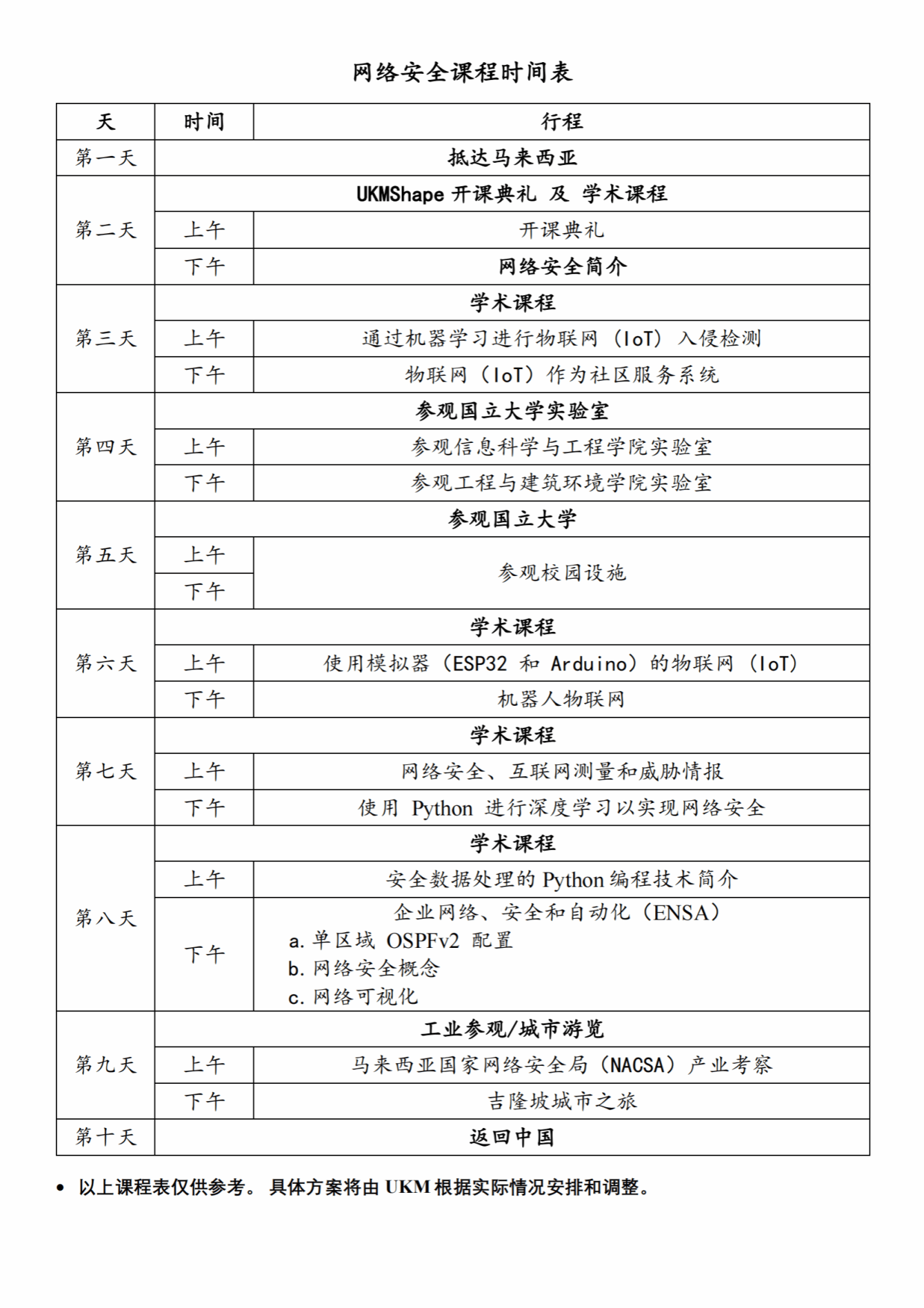 《网络安全》暑期访学项目,将由UKM信息科学与技术学院网络安全中心教授、专家承担教学工作,并组织学生参观网络安全实验室和美丽校园,并参访马来西亚国家网络安全局(NACSA)。马来西亚国立大学UKM自2000年开展计算机安全领域的研究,于2010年UKM已与马来西亚网络安全局CSM开展合作,2013年,UKM和CSM合作签署实施网络安全培养计划,开展网络安全硕士和网络安全专业认证课程。此外,UKM信息科学与技术学院FTSM与马来西亚皇家警察部PDRM和马来西亚SIRIM等其他利益相关者建立研究合作,UKM已成为马来西亚国家网络安全的守护者角色。