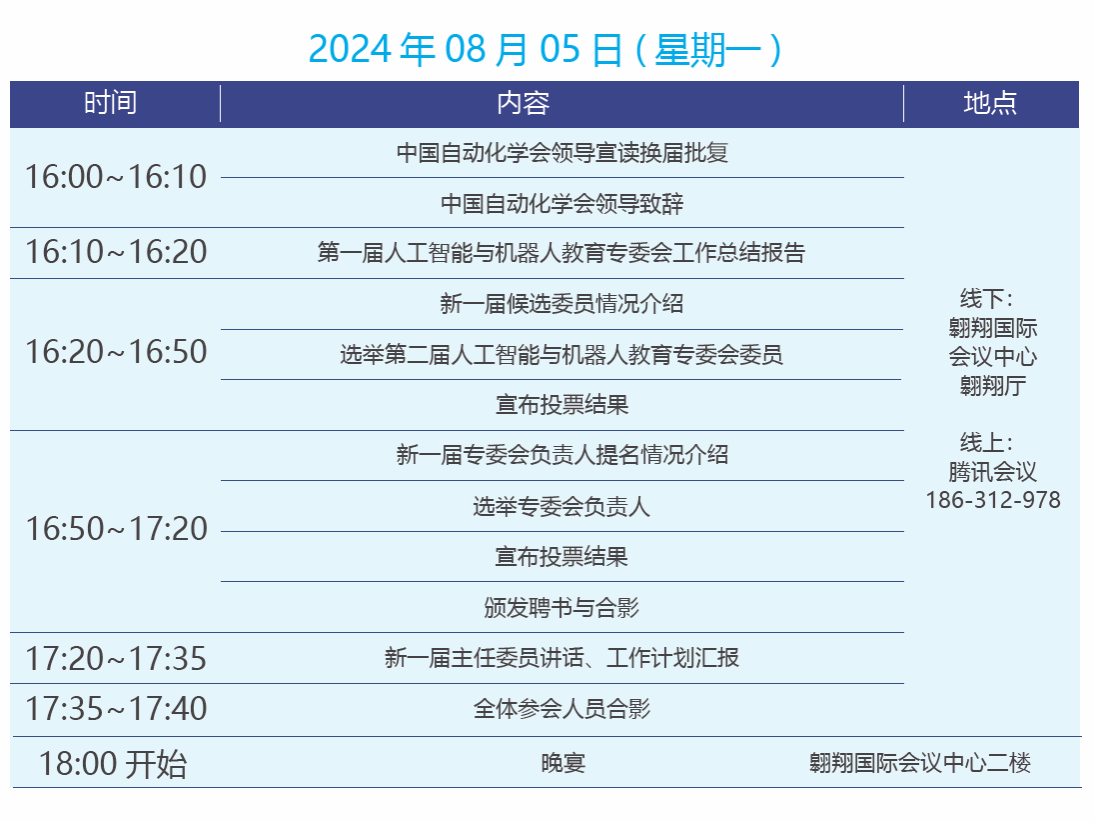 此次年会邀请国内外知名专家学者做精彩报告,将分四个专题探讨人工智能与机器人的相关基础领域最新的研究成果、前沿思维和创新技术。同时,拟定于2024年8月5日下午召开第二届CAA人工智能与机器人教育专委会换届大会,本次大会将选举第二届人工智能与机器人教育专委会委员,并选举专委会负责人。