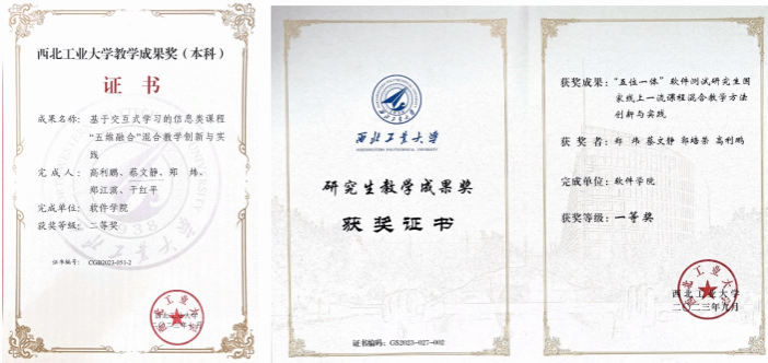 研究生培养质量提升工程项目“目标驱动的《软件测试》课程专业型和学术型研究生分类培养方法研究”,并获校2023年本科教学成果二等奖、2023年研究生教学成果一等奖等。