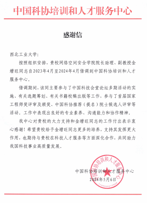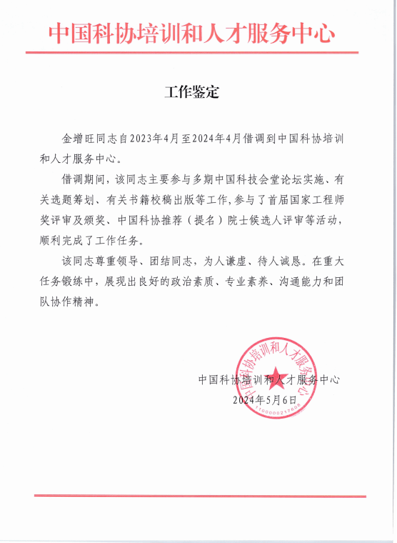 金增旺同志积极服从组织安排,认真完成学校和学院交办的工作任务。在借调中国科协培训和人才服务中心综合处期间,他担任高级项目主管,主要负责多期中国科技会堂论坛的实施、选题筹划、书籍校稿出版等,以及论坛投标、信息化平台等保评审,负责女性科技工作者专委会、高校科协、人事招聘等工作,深度参与首届国家工程师奖评审及颁奖、第三届全国创新争先奖颁奖、中国科协推荐(提名)院士候选人评审等重要活动。他突出的能力和优秀的工作业绩赢得了单位同事的一致好评,得到借调单位领导的高度肯定和评价,中国科协培训和人才服务中心专门发来感谢信,赞扬该同志的出色工作。该同志的工作不仅展现泰国av