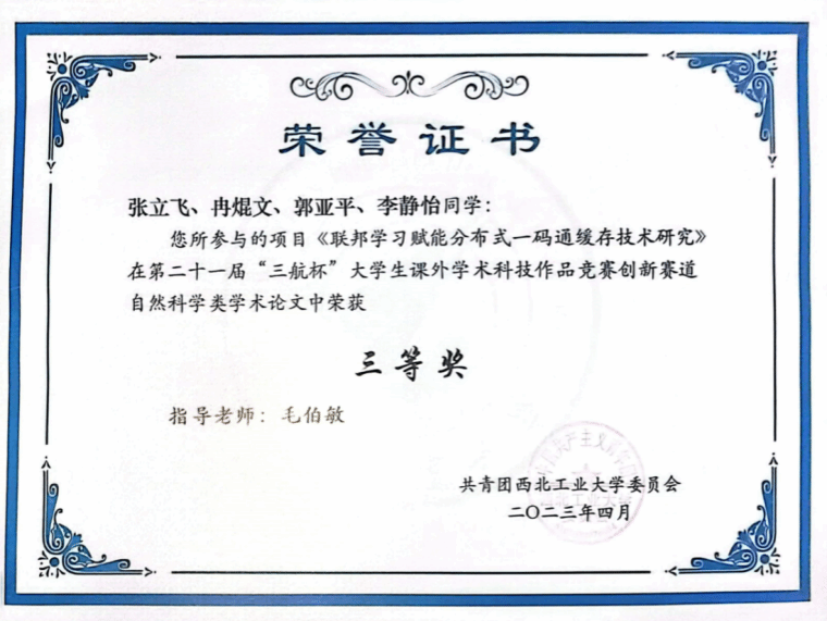。曾多次荣获校二等奖学金、优秀大学生等荣誉称号。曾带队获得国家级大创良好结题1项,三航杯校级三等奖1项,铜奖1项,授权软著1项,国际会议论文1篇。