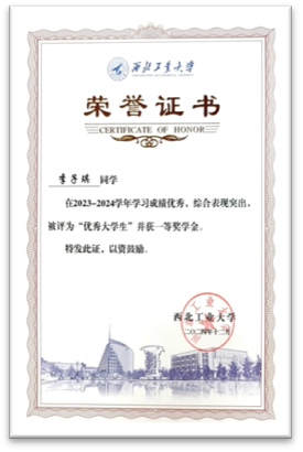 获校一等奖学金及文艺先进个人等4 项荣誉称号