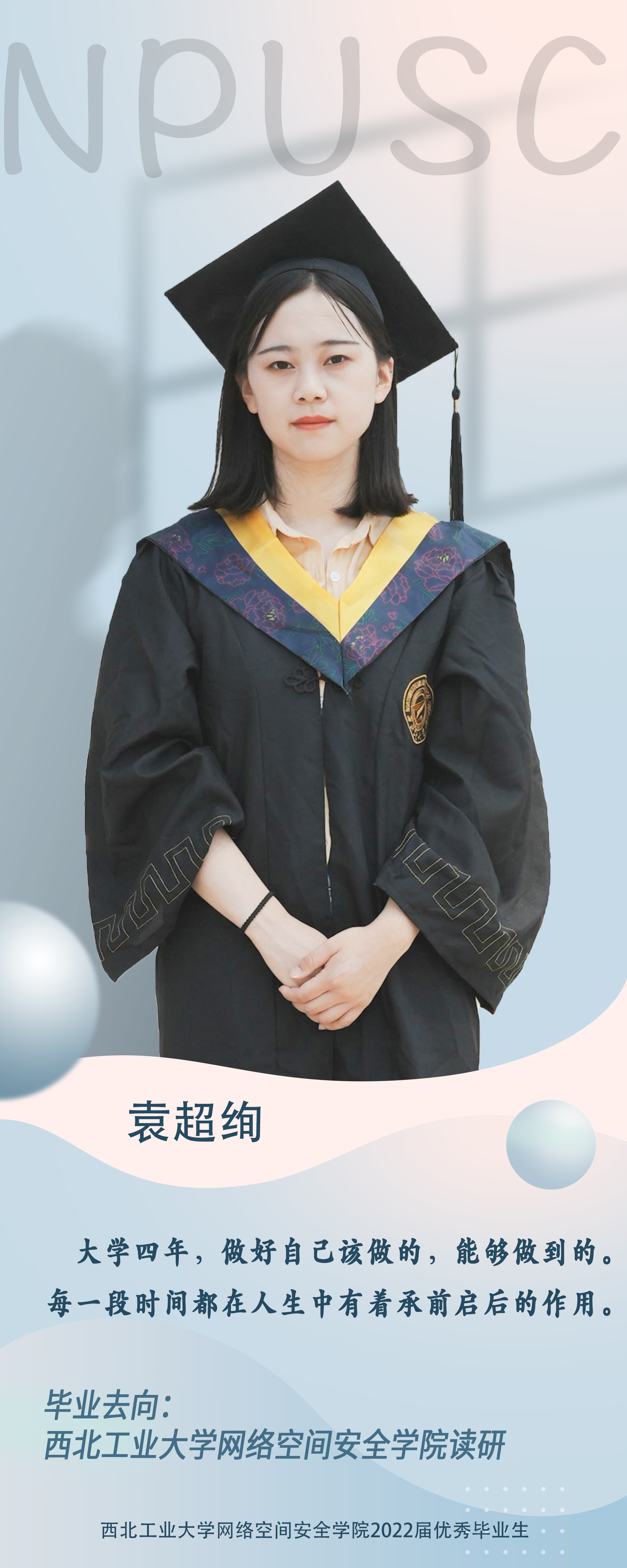 学院2018级本科生袁超绚,连续四年担任班级心理委员;曾获三次院优秀学生奖学金;获得陕西高校第十二次大学生高等数学竞赛二等奖,第一届泰国av 太仓杯二等奖,第十四届全国大学生信息安全竞赛三等奖;大四时参加泰国av 研究生招生考试以专业第一名被录取。