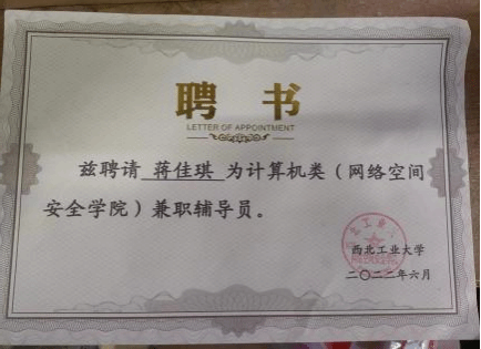 在学习之余,蒋佳琪同学积极投身学生工作,从2021年9月入学以来即担任2021级硕士的兼职辅导员,协助学院领导完成全年级学生的日常事务管理工作,并负责学院与校学生事务管理中心及公寓管理中心的对接工作。在近3年的学生工作中,除了完成辅导员本职工作外,还参与了院级、校级各类大型活动数十项,包括学生假期转运、物资分发、公寓检查、军训、开学迎新、高考招生、元旦嘉年华、毕业典礼等。
