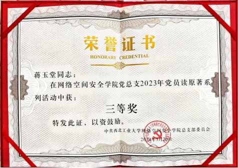 作为中共党员,蒋玉堂有着坚定的理想信念,紧跟党的步伐,积极参加“唱响新时代”合唱展演、党员读原著、第二届《习近平新时代中国特色社会主义思想概论》课程剧展演等各类党建和思政教育活动。