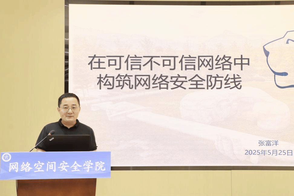 接着,张富洋以《在可信不可信网络中构筑网络安全防线》为题做第二场报告。他从日常工作生活、国际形势变化等多个角度层层剖析了网络空间的信任危机,并为同学们展示了诸多国家级网络对抗的重大事件(例如,震网病毒)。就电信诈骗话题,他通过分享典型诈骗案例、分析电诈信息来源,呼吁同学们要提高反诈意识。报告尾声,张富洋列举了日常生活中存在安全隐患的各种行为,并阐释了各领域构筑网络安全防线的方法。