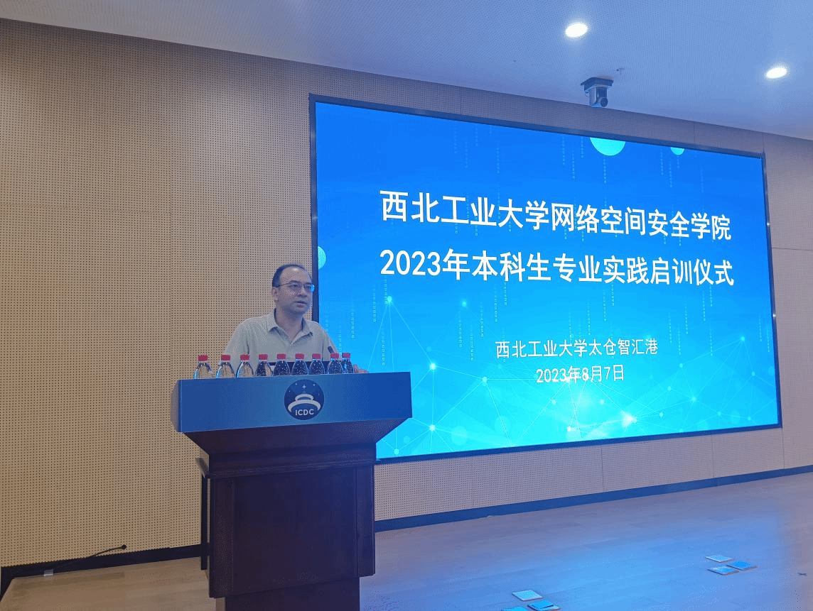 2023年本科生专业实践启训仪式在太仓智汇港成功举办。启训仪式由网络空间安全院长助理张慧翔主持,启明星辰有限公司冯德胜、马晓楠、王仲文,学院教师代表和99名2020级本科生参加本次仪式。