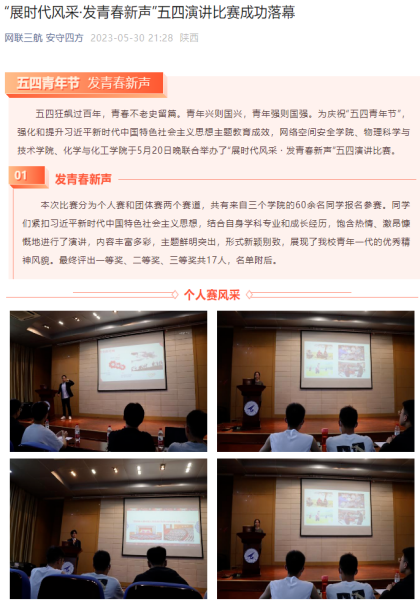 (二)党建带团建,坚持“全团抓引领”。我院团委持续开展“学党史、强信念、跟党走”主题教育,开展“党员读原著”主题教育专题栏目,党员领着团员学,已发布专栏86期,累计阅读量10000+。紧跟时事热点,举办“五四青年说”主题演讲比赛;以庆祝新中国成立75周年为契机,举办校级主题征文比赛;邀请大学生青年宣讲团开展红色主题教育,把引领广大同学争做“总师型人才”作为做好一切工作的“题眼”,助力网安青年接好历史接力棒,赓续红色基因。五年来,我院青年大学习学习率持续提高;“青年回家”和团员组织关系转接工作顺利完成;主题团日活动扎实有效开展,SC012101团支部、SC012001团支部、DL062247团支部、DL062450团支部开展的团日活动多次获评“优秀主题团日活动”;积极落实团支部纵向改革,智慧团建工作井然有序。一直以来,我院团委始终注重加强对团学骨干的培养教育,每学期至少开展一次面向团学组织骨干及志愿者的相关知识技能培训讲座,按时召开全体会议。团学干部积极参与“翱翔学生骨干计划”、“骨干进阶班”、“交叉任职计划”,保证团学干部队伍的纯洁性和积极性,学院多位学生获评“优秀大学生”、“十佳学生会干部”、“十佳团支书”等荣誉,学院信安协会荣获学校“五星级社团”、“模范学生团队”。求真务实,争当先进,增强团组织的凝聚力和战斗力,信安协会团支部荣获“五四红旗团支部”称号,学院多名团员青年荣获“五四红旗标兵”、“优秀共青团干部”等荣誉。带动全院形成活泼向上、全面发展的良好氛围。