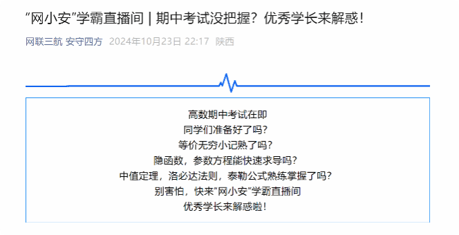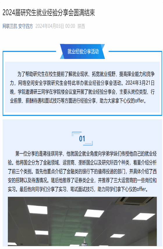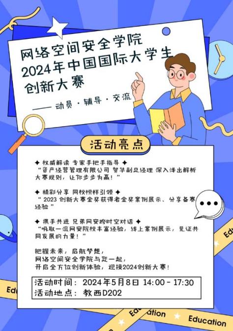 新生手册》,字数达15000+,覆盖学习、生活、学生工作、综测等各方面,帮助网安学子“扣好”大学的第一粒扣子。打造“网小安”直播间,邀请优秀网安学子,围绕微积分、计算机系统基础等课程学习以及校园成长等方面的问题为同学们解答疑惑;面向全校举办“恋爱主题讲座”,引导同学们树立正确的恋爱观,实现“德智体美劳“全面发展;打造网安特色CTF教学公开课,面向全校同学讲解相关专业知识,普及学科基础,提高竞赛参与度,实现以赛促学。持续举办考研、保研、就业经验分享会,全方位答疑解惑,助力网安学子升学、就业。文体活动方面多点开花,学院学生辩论队获“精英杯”辩论赛冠军,校篮球赛亚军、校运动会篮球项目亚军。积极联合兄弟学院开展科创文化节、迎新晚会等活动,备受同学好评。
