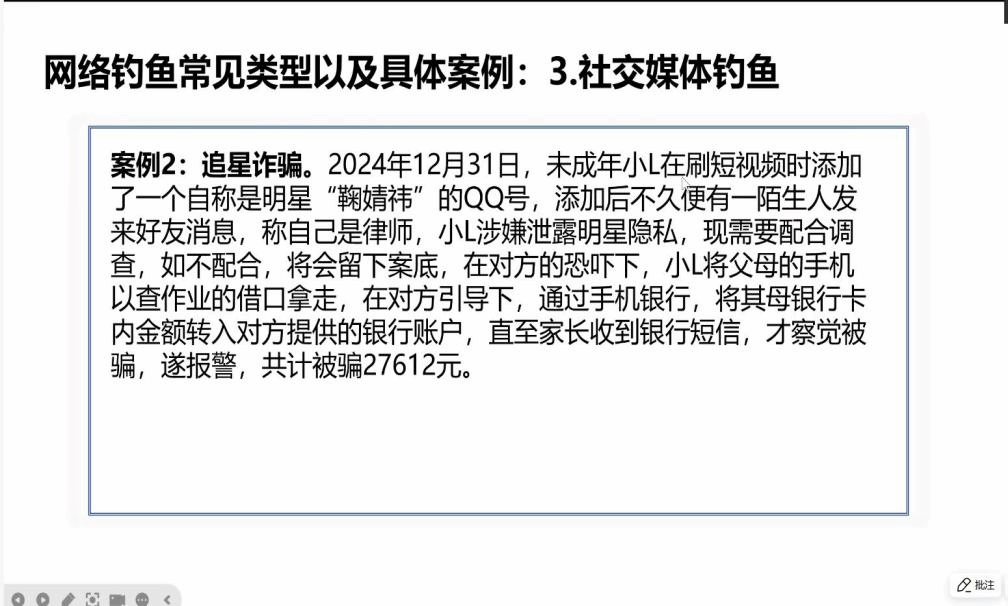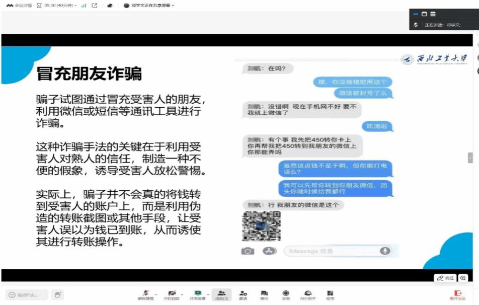 随着互联网的迅猛发展,人与人之间的联系愈发便捷,然而,这却也悄然为诈骗分子打开了方便之门。2月8日,邓学文同学带来了第四期精彩的主题课程,聚焦于熟人诈骗与新型AI诈骗的防范。课程首先深入剖析了诈骗分子常冒充熟人实施诈骗的狡猾手法,通过“班主任收费”和“冒充好友借钱”两个真实案例,生动揭示了此类诈骗的惯用套路此外,课程还及时关注到“AI换脸”等新型诈骗手段的崛起,详细阐述了其危害性,并总结了AI诈骗的常见手段与防范措施,助力同学们提升防范意识,守护自身财产安全。