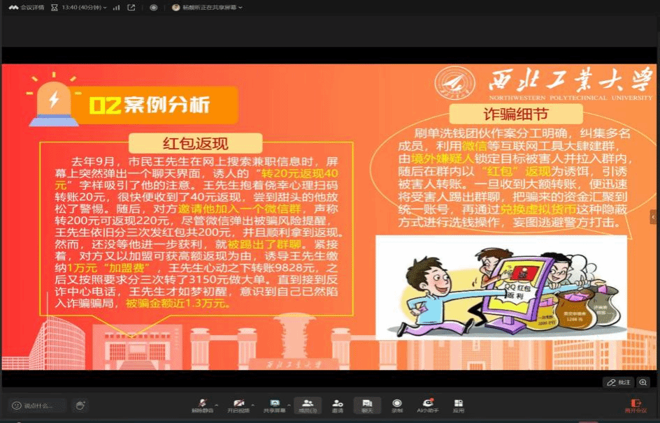 春节前夕,红包诈骗手段层出不穷。为提升同学们的反诈意识,杨靓昕同学于1月27日在云端开展了第一期反诈课程。课程详细介绍了面对红包二维码链接诈骗时的“六大法宝”,并通过列举“恶意红包链接”、“抢红包神器”以及“微信群抢到大红包却遭遇诈骗”的真实案例,生动形象地让同学们了解了相关情况。此外,还深入浅出地讲解了红包投资返利诈骗的防范知识,为同学们度过一个欢乐祥和的春节增添一份保障。