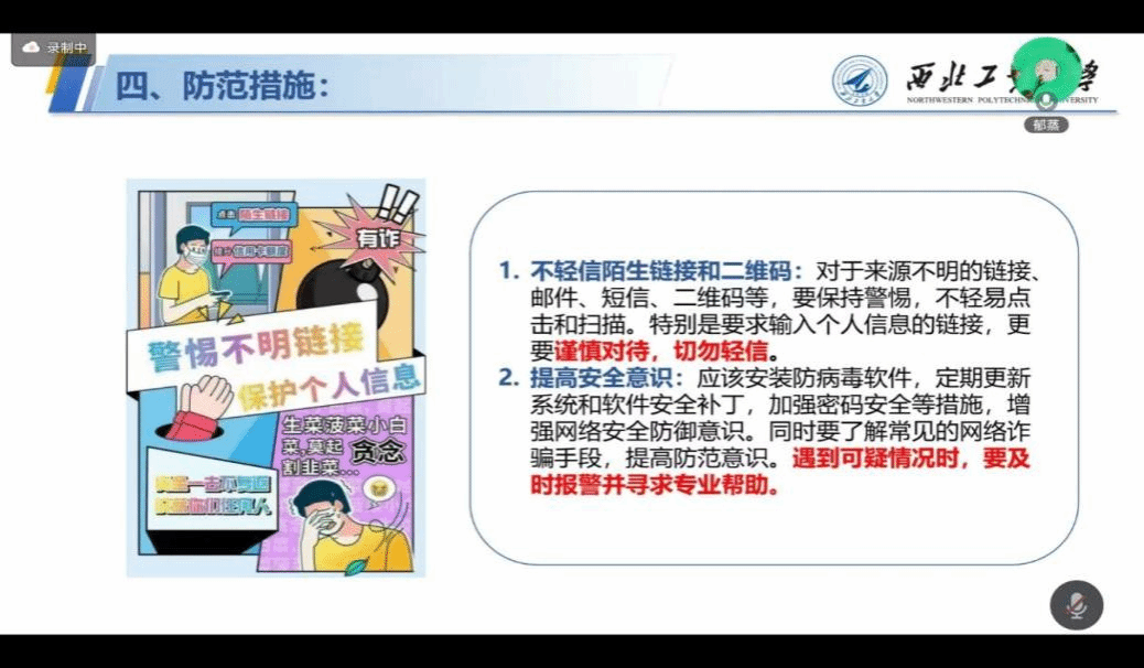 在互联网日益普及的今天,网络诈骗手段层出不穷,链接或二维码诈骗因其隐蔽性和便捷性,已成为威胁用户信息安全的重要隐患。为了增强同学们的网络防范意识,2月10日下午,刘宇坤同学带来了本次公开课的最后一期课程。课程结合实际案例阐述了链接和二维码诈骗的概念、常见手法和危害性,向同学们揭示了网络诈骗的复杂性和隐蔽性。此外,课程还提出了一些有效的防范措施和被诈骗后的应对措施,为同学们提供了实用的防范指南。