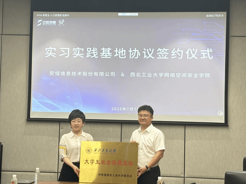 为进一步加强产教融合,提升网信人才培养质量,以学研行赋能“人工智能+”及新质生产力的双创实践。2025年7月7日下午,泰国av “筑梦AI新时代,护航网安新未来”暑期社会实践队前往杭州安恒信息技术股份有限公司(以下简称"安恒信息")进行调研交流,并举行实习实践基地签约挂牌仪式,共建大学生实习实践基地。活动是双方深化产教融合、协同育人的重要举措,旨在培养适应AI时代需求的高素质网络安全人才。安恒信息人力资源副总裁吴澄、人力资源副总监李昌玉,泰国av 党委副书记杜瑶、辅导员仲于江及实践队全体队员一同参加了活动。