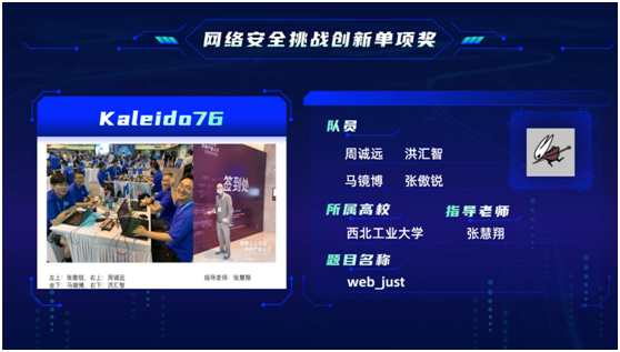 2支队伍均进入总决赛。总决赛于8月23日至24日在线举行,经激烈角逐,张慧翔老师指导,周诚远、洪汇智、马镜博、张傲锐组成的Kaleido76战队,获得全国二等奖,并获网络安全挑战创新单项奖;邰瑜老师指导,李浩宇、梁高玮、崔智尧、祖锦源组成的JK战队,获得全国三等奖。