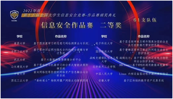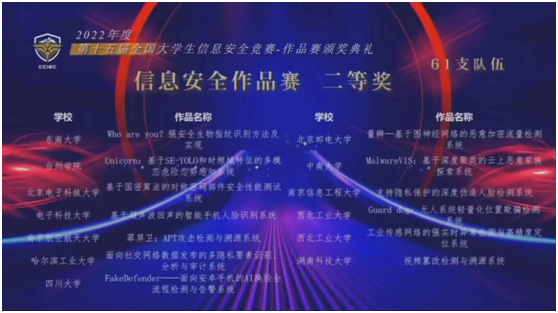 3支队伍入围。总决赛于8月20日至21日经过在线答辩、作品演示、评委质询、专家现场评分,刘航老师指导,杨轶帆、杨之铭、孔令怡、彭乐赟完成的作品“Guard dog:无人系统轻量化位置欺骗检测系统”,曹国彦老师指导,于锦阳、郑贺源、周奇完成的作品“工业传感网络的强实时异常检测与高精度定位系统”,杨黎斌老师指导,韩骥远、刘展、魏凯航、李勇邦完成的作品“‘秦岭道士’物联网僵尸网络主动探测系统”,均获得全国二等奖。