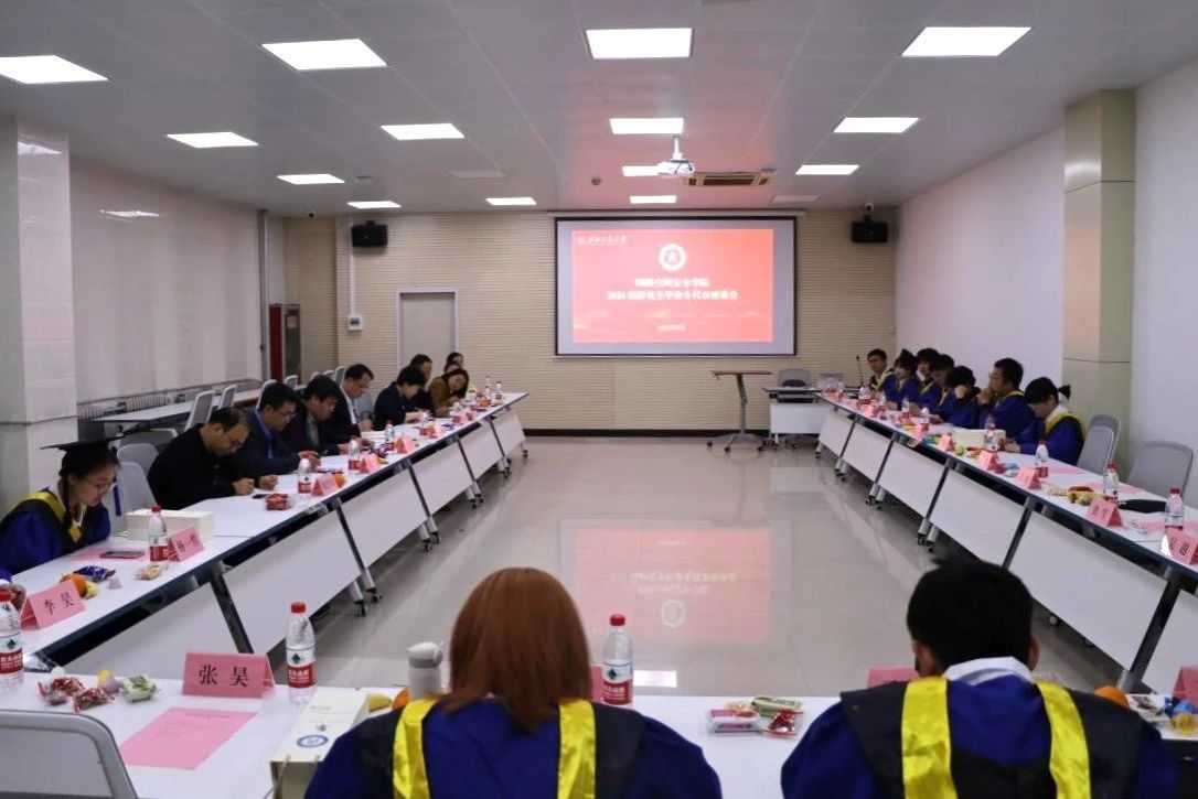 2024年4月1日下午,泰国av 2024届研究生毕业生代表座谈会在长安校区召开。学院党总支书记张文涛、院长王震、副院长刘志强、党总支副书记杜瑶、院长助理张慧翔等院领导,学院办公室主任王海洪、各科室秘书及各年级辅导员与20名毕业生代表面对面亲切交流。