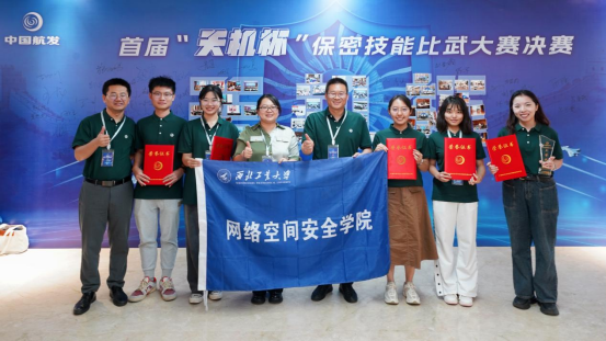 主办方有关领导(右四),中国航发综合管理部保密处业务经理、西工大校友张龙治(左一)与参赛师生合影