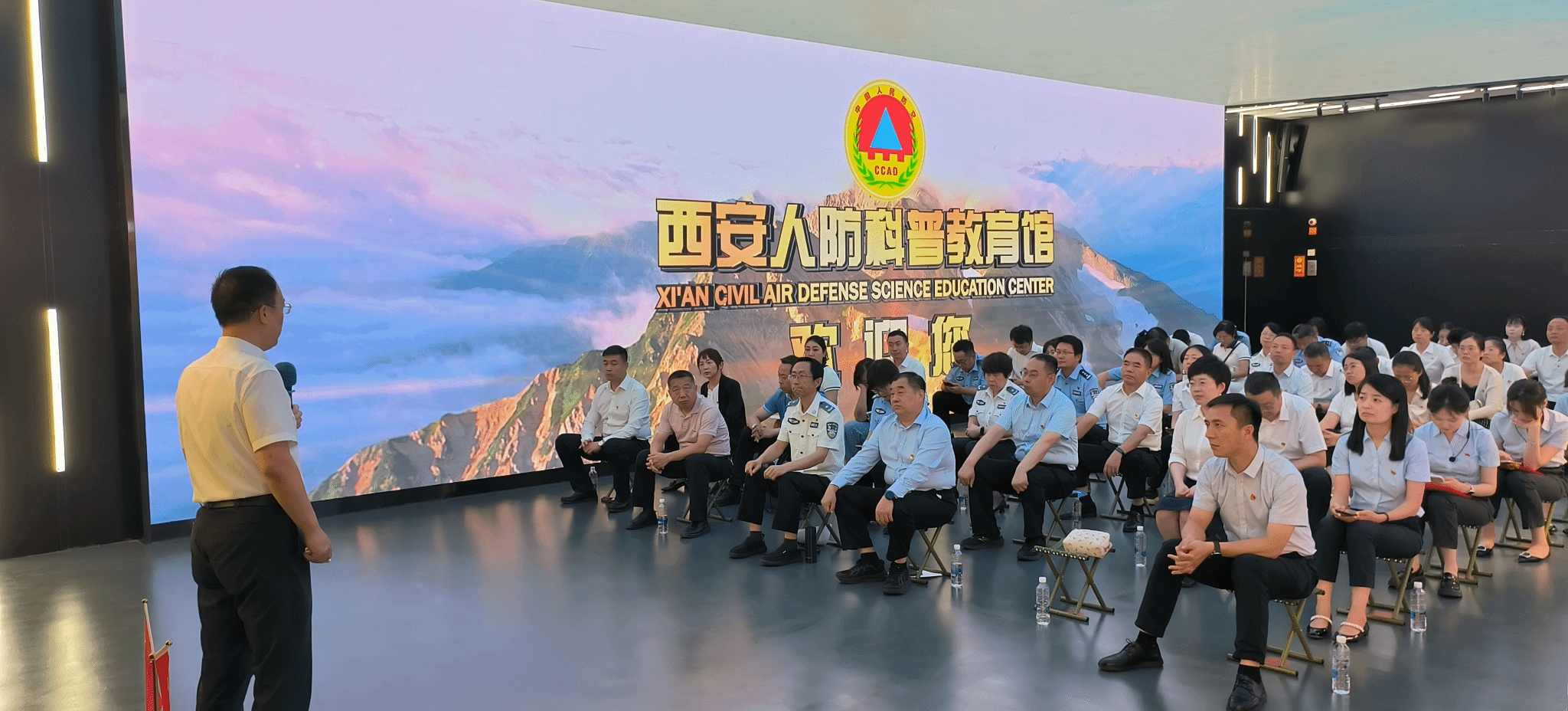 仪式结束后,全体人员在讲解员的引导下参观了西安人防科普教育馆。作为西安市唯一的人防主题科普教育馆,该馆通过“居安思危”、“长空之危”、“永宁之盾”等七大主题展区,结合丰富的互动体验设施,系统普及防空防灾知识,有效提升公众的应急防护能力。