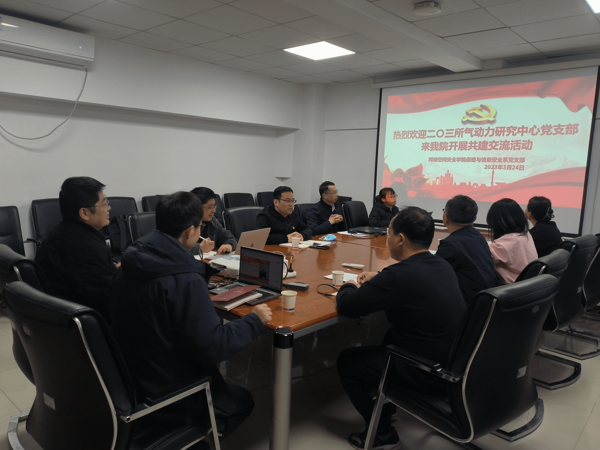 保密与信息安全系党支部与中国兵器203所气动力研究中心党支部在爱生楼401会议室开展了党建共建交流活动。会议由学院党总支副书记禹亮主持,双方支部成员参加了本次共建交流活动。
