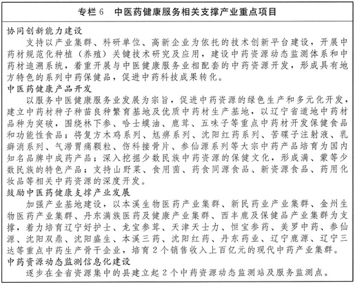 (六)积极促进中医药健康服务相关支撑产业发展。加强中医药科技创新技术平台建设,积极扶持辽宁省重大新药创制综合平台、国家沈阳药物安全评价与研究中心、国家中药新药临床试验关键技术平台、大连中药现代化工程中心、辽宁中医药大学附属医院国家中医临床研究基地、辽宁中医药大学省中医药临床研究中心和心血管中医药转化医学中心等创新平台的发展。促进中药资源可持续发展,完成全省中药资源普查工作;鼓励发展中医药健康器械的研发、制造和应用;加强中药材种子种苗良种繁育基地建设及优质中药材生产基地建设;实施中药材生产质量管理规范(GAP);结合丹东、本溪、抚顺、铁岭、鞍山、辽阳等辽宁传统特色道地药材区域优势,全力打造辽宁道地药材品牌。鼓励发展中医药健康服务支撑产业集群,逐步形成集规范种植、饮片加工、提取物生产、创新中成药和相关保健产品开发为一体的中药产业链。培育满、蒙特色民族医药,促进其科研成果的临床应用。(省经济和信息化委牵头,省科技厅、省国土资源厅、省农委、省卫生计生委、省政府金融办、省食品药品监管局配合)
